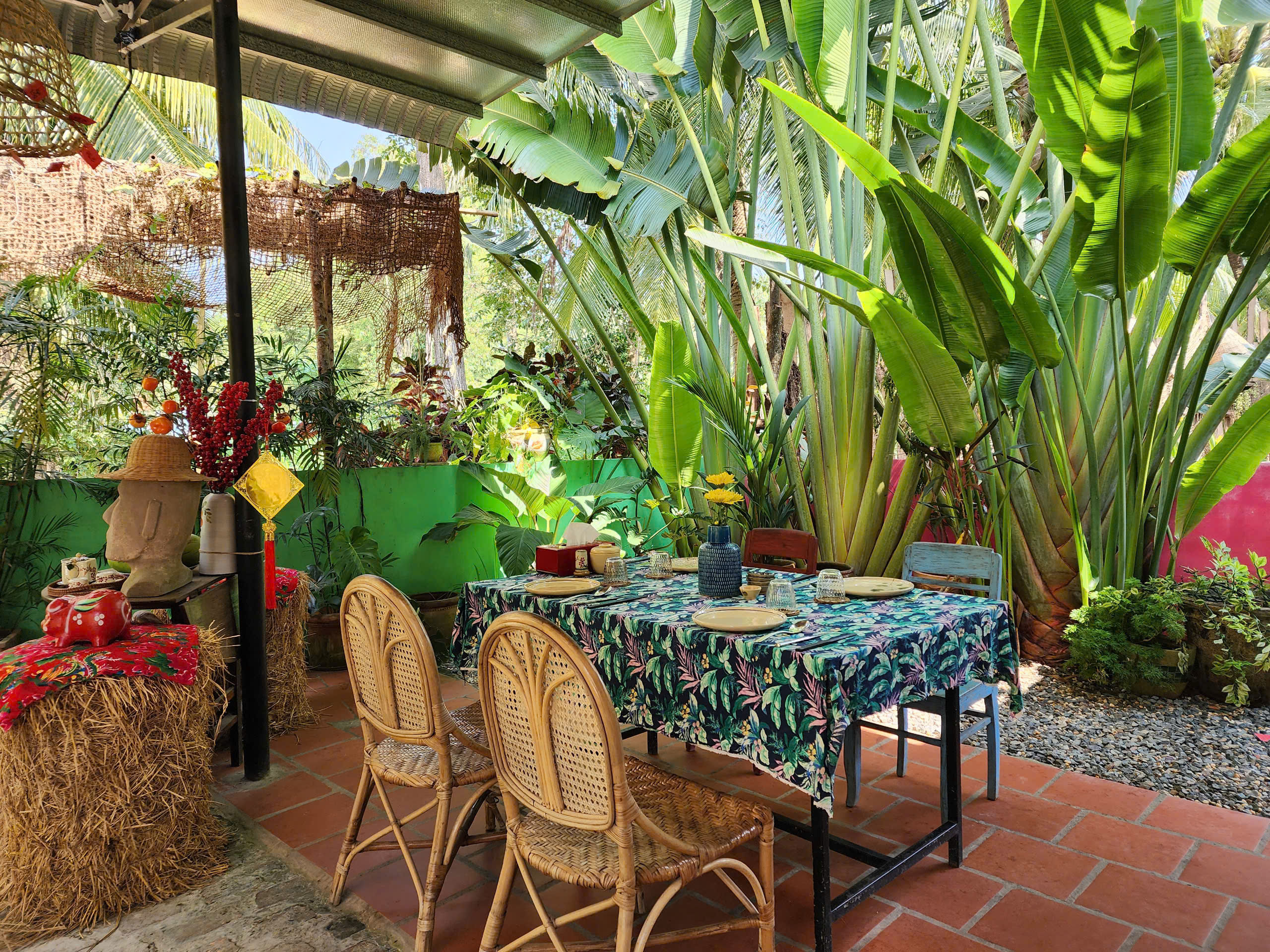 Start your day with a light and healthy countryside breakfast featuring tropical fruits, homemade cakes, and hot tea/coffee.