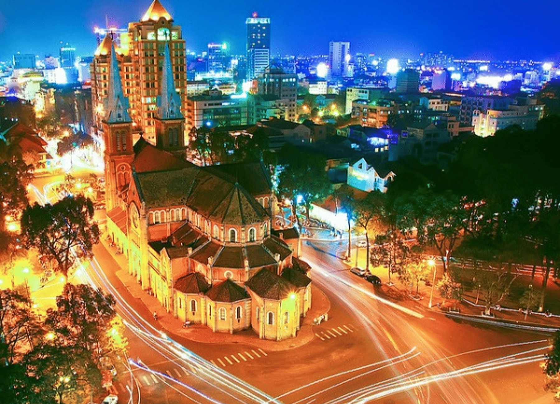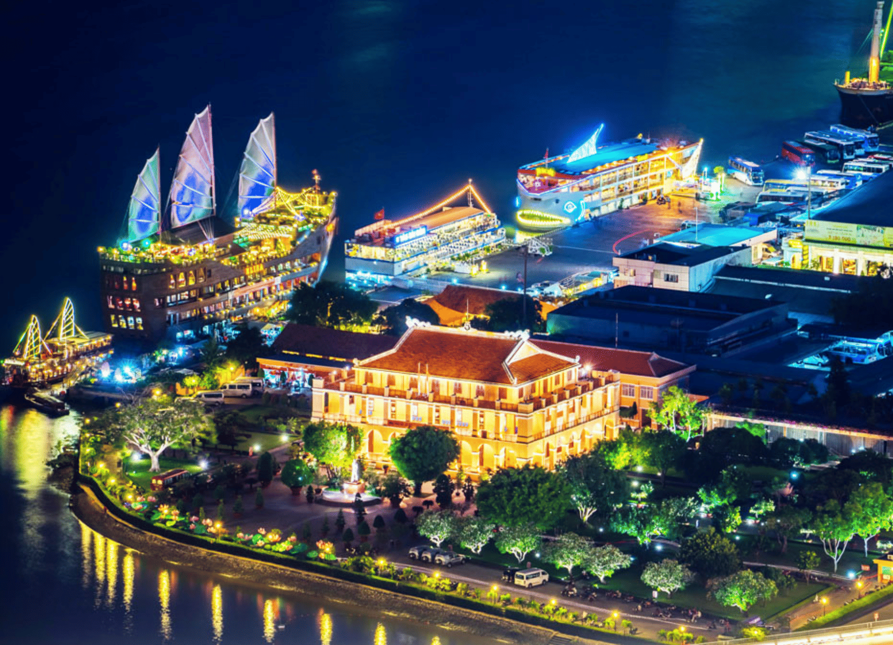 Begin at Nguyen Hue Walking Street, the vibrant heart of the city. From there, ride past the scenic Bach Dang Wharf along the Saigon River, where modern skyscrapers meet colonial heritage.