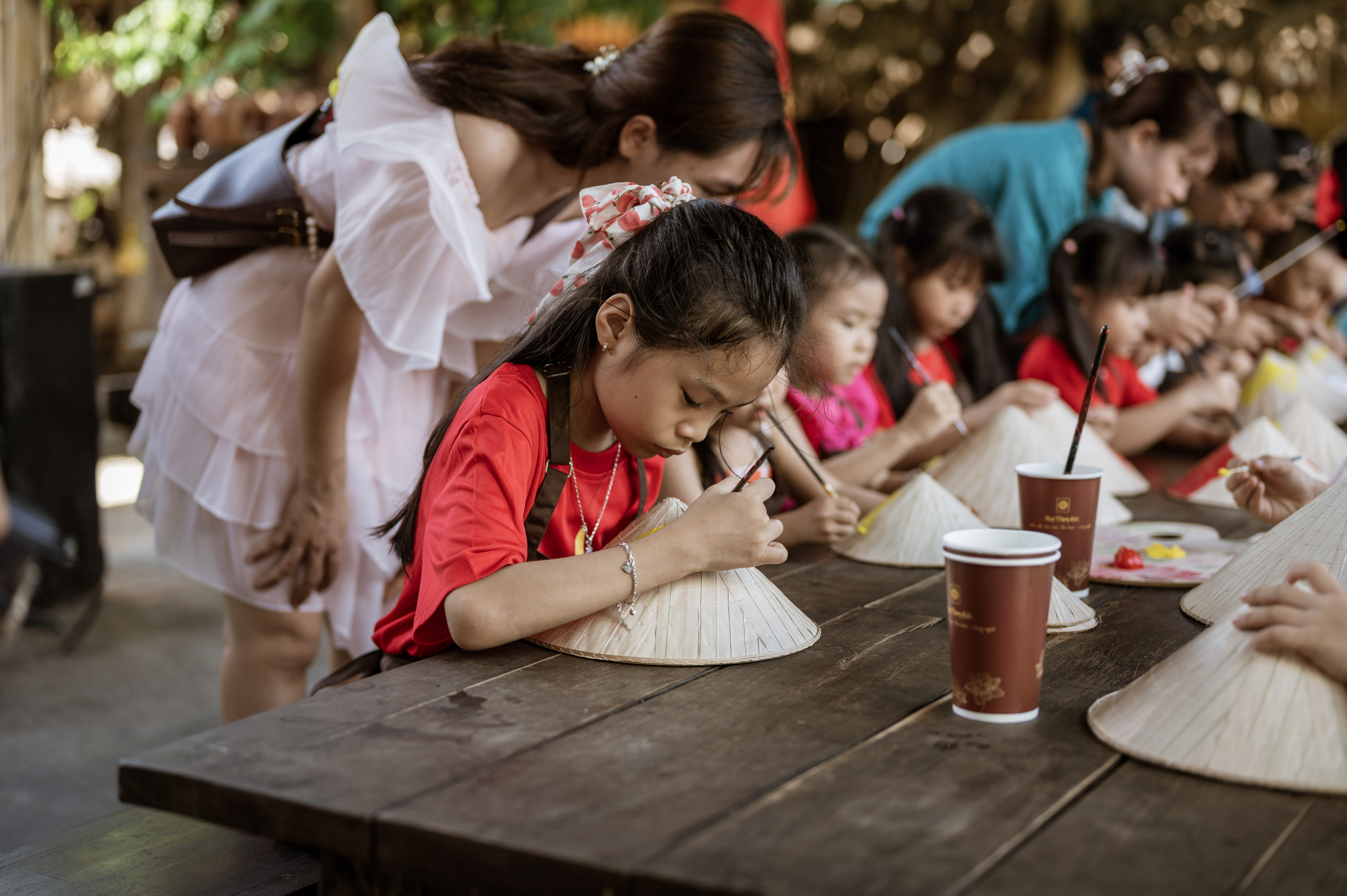 After the introduction, unleash your creativity. Using natural colors and inspiration from Vietnamese landscapes, traditional patterns, flowers, and calligraphy, paint your very own conical hat.
